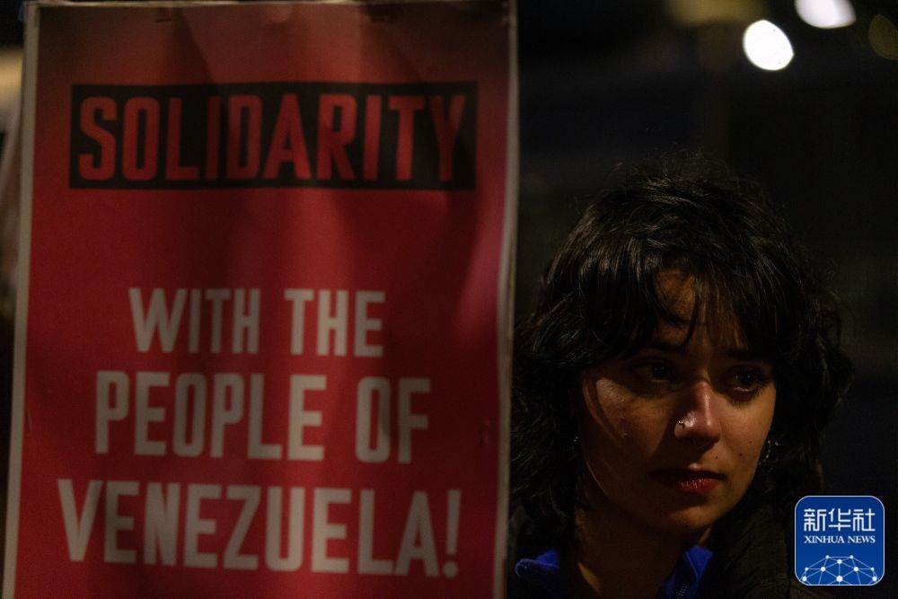 1月4日,一名女子在西班牙马德里市中心的美国驻西班牙大使馆前参加抗议活动,谴责美军突袭委内瑞拉。新华社记者 孟鼎博 摄