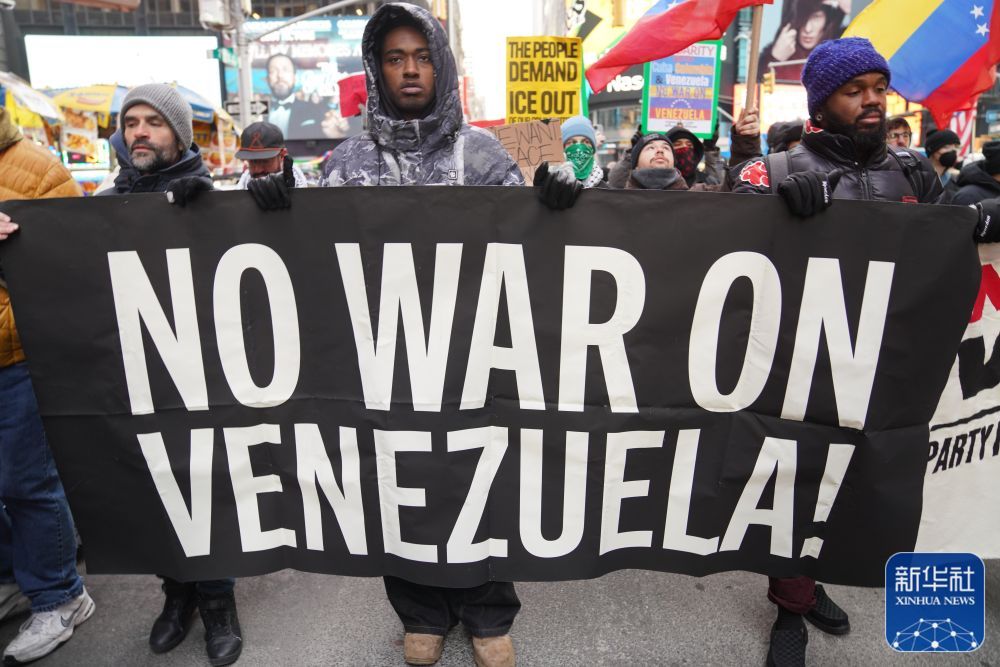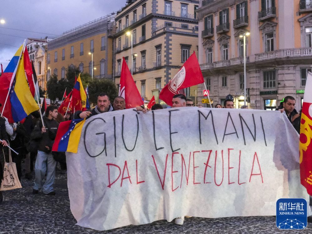 1月3日,在意大利那不勒斯,当地民众手持写有反对干涉委内瑞拉内容的标语参加抗议活动。新华社发