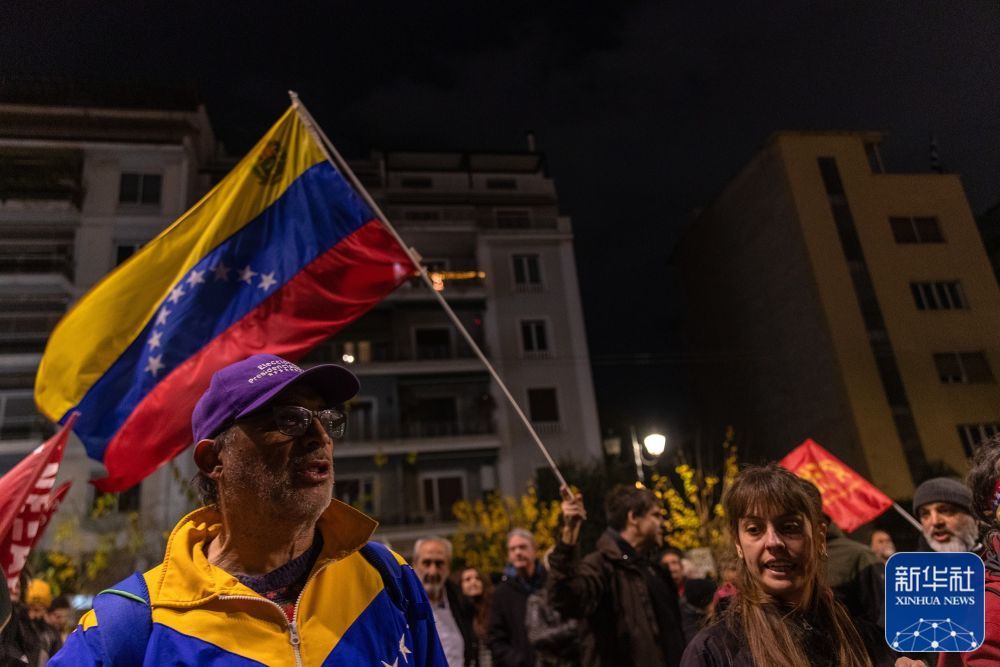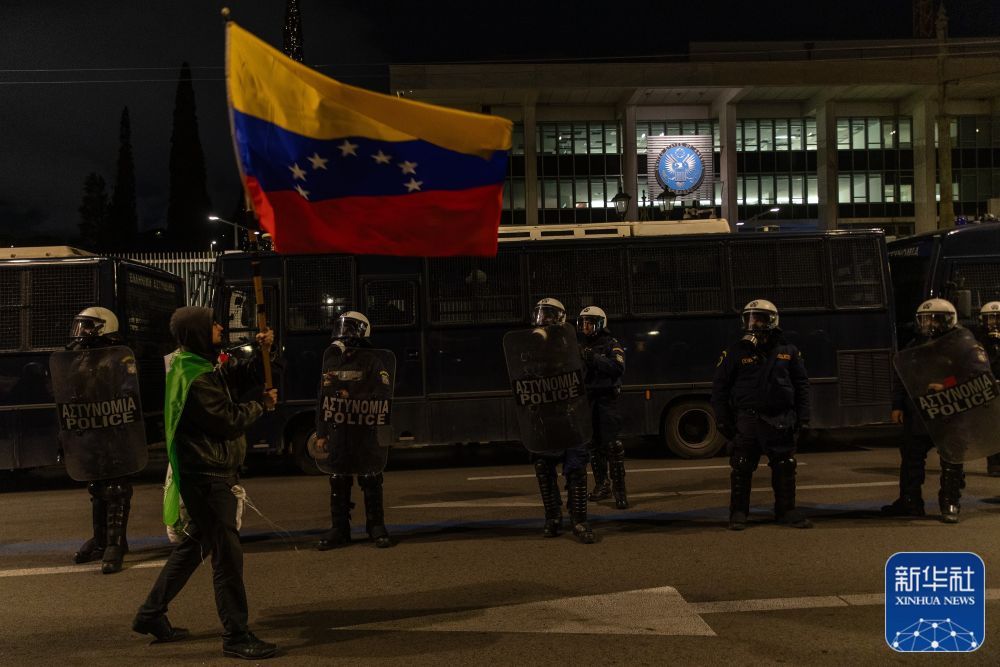 1月3日,在希腊首都雅典,当地民众在美国驻希腊大使馆外参加抗议活动。新华社发(马里奥斯·罗洛斯摄)