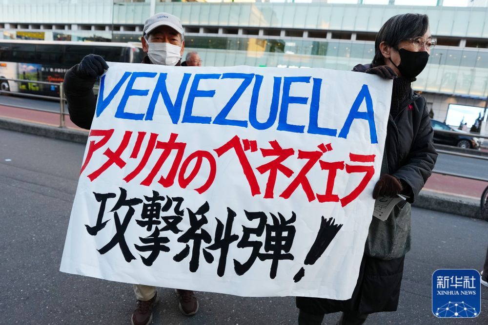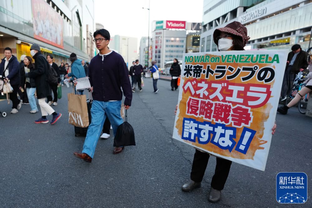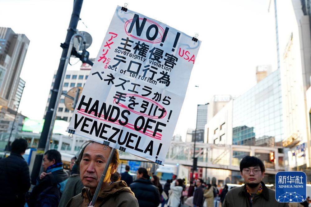 月4日,在日本东京新宿站前,日本民众参加抗议活动,谴责美军突袭委内瑞拉。新华社记者 贾浩成 摄