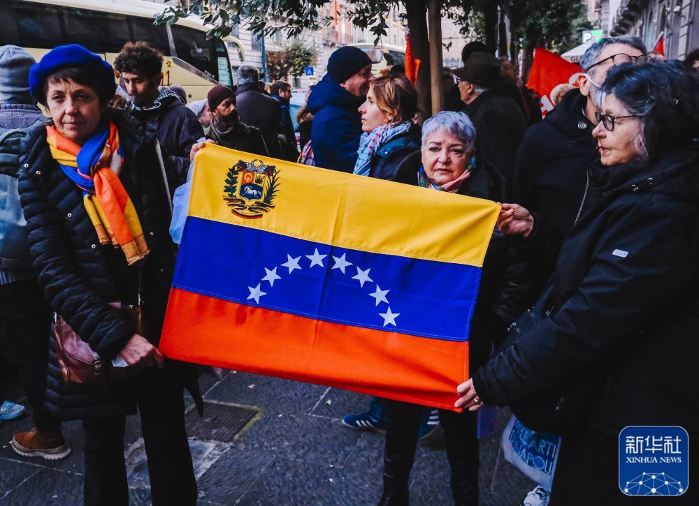 1月3日,在意大利那不勒斯,当地民众手持委内瑞拉国旗参加抗议活动。新华社发