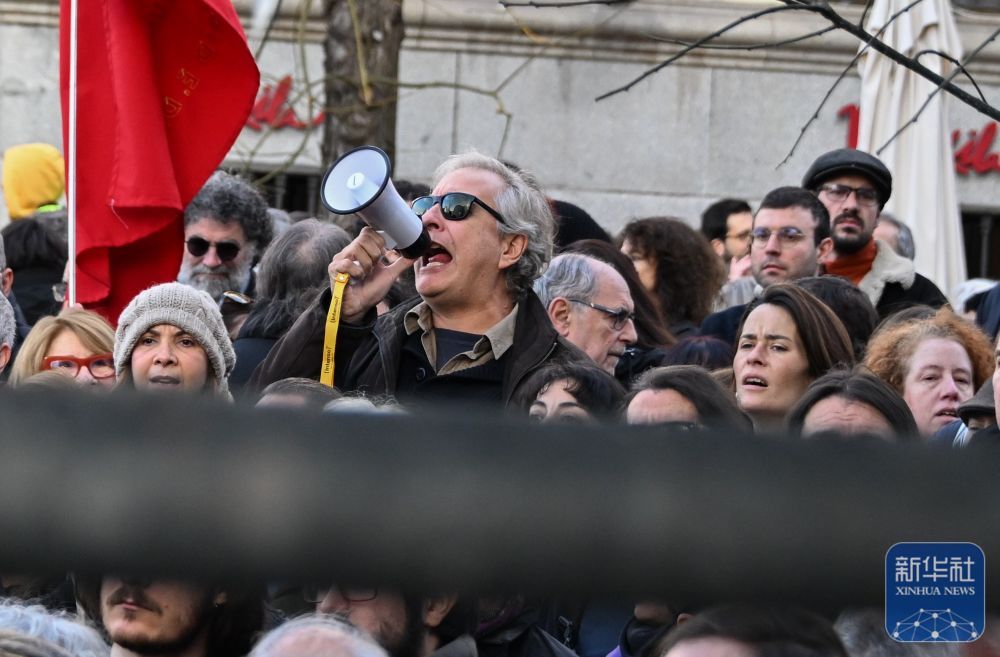 1月4日,民众在西班牙马德里市中心的美国驻西班牙大使馆前,抗议美国对委内瑞拉的军事行动。新华社记者 程敏 摄